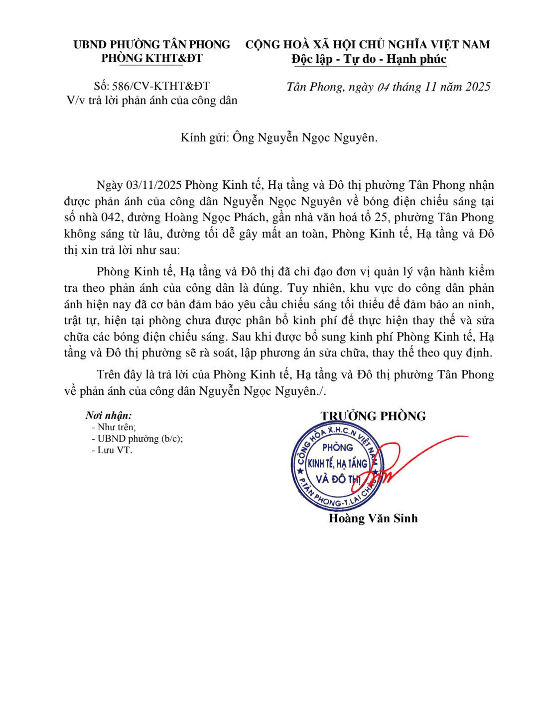 Ngày 03/11/2025 UBND phường Tân Phong nhận được phản ánh của công dân Nguyễn Ngọc Nguyên về bóng điện chiếu sáng tại số nhà 042, đường Hoàng Ngọc Phách, gần nhà văn hoá tổ 25, phường Tân Phong không sáng từ lâu, đường tối dễ gây mất an toàn, UBND phường đã chỉ đạo Phòng Kinh tế, Hạ tầng và Đô thị phối hợp đơn vị quản lý vận hành kiểm tra theo phản ánh của công dân là đúng. Tuy nhiên, khu vực do công dân phản ánh hiện nay đã cơ bản đảm bảo yêu cầu chiếu sáng tối thiểu để đảm bảo an ninh, trật tự. Đồng thời năm 2025 phường chưa được phân bổ kinh phí để thực hiện thay thế và sửa chữa các bóng điện chiếu sáng do đó chưa thực hiện thay thế các bóng điện trong khu dân cư. Sau khi được bổ sung kinh phí UBND phường sẽ chỉ đạo Phòng Kinh tế, Hạ tầng và Đô thị phường rà soát, lập phương án sửa chữa, thay thế theo quy định.