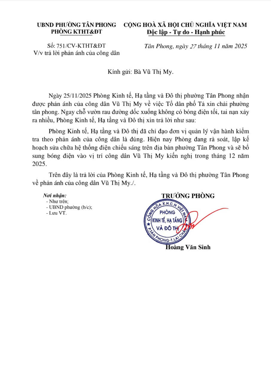 Sau khi nhận được phản ánh của công dân Vũ Thị My, UBND phường Tân Phong đã chỉ đạo Phòng Kinh tế, Hạ tầng và Đô thị, đơn vị quản lý vận hành kiểm tra theo phản ánh của công dân. Hiện nay Phòng Kinh tế, Hạ tầng và Đô thị đang rà soát, lập kế hoạch sửa chữa hệ thống điện chiếu sáng trên địa bàn phường Tân Phong và sẽ bổ sung bóng điện vào vị trí công dân Vũ Thị My kiến nghị trong tháng 12 năm 2025.