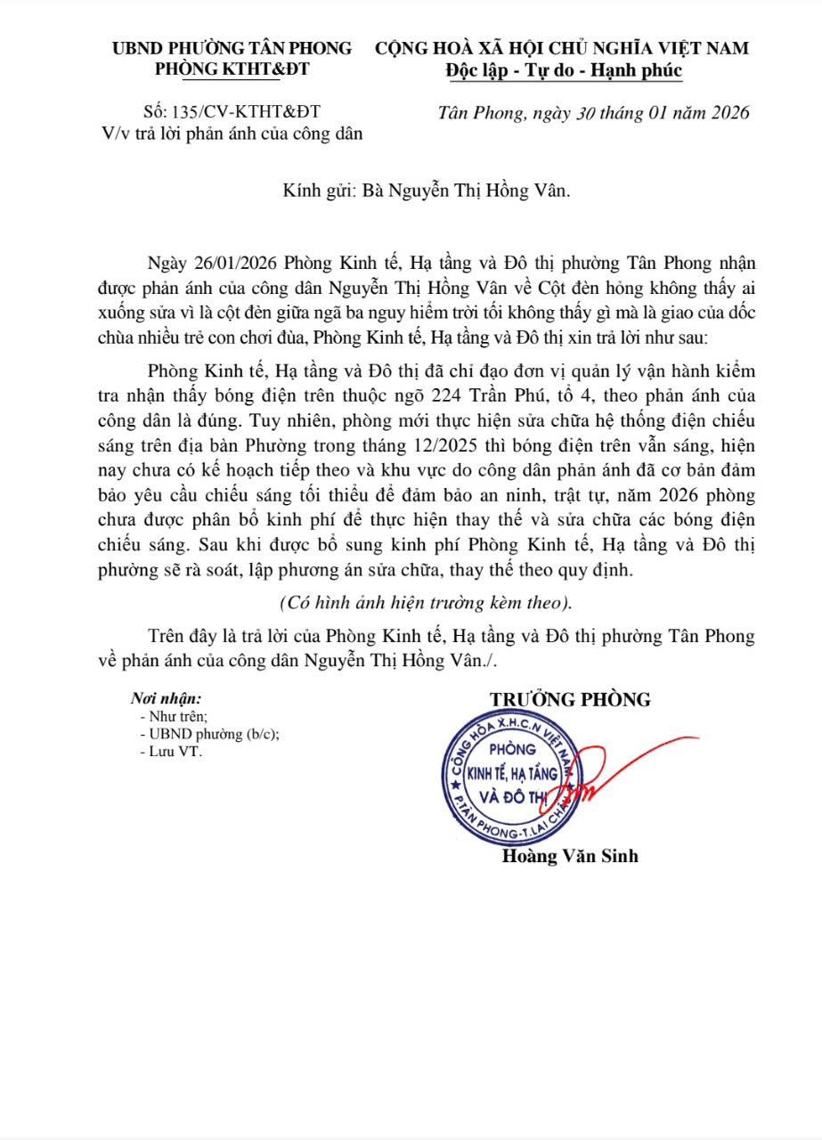 UBND phường đã chỉ đạo Phòng Kinh tế, Hạ tầng và Đô thị phối hợp đơn vị quản lý vận hành kiểm tra bóng điện trên thuộc ngõ 224 Trần Phú theo phản ánh của công dân. Tuy nhiên, UBND phường mới thực hiện sửa chữa hệ thống điện chiếu sáng trên địa bàn (qua rà soát tại thời điểm tháng 12/2025 bóng điện trên vẫn sáng). Năm 2026 phường chưa được phân bổ ngân sách để sửa chữa bóng điện chiếu sáng các khu dân cư, đồng thời khu vực do công dân phản ánh đã cơ bản đảm bảo yêu cầu chiếu sáng tối thiểu để đảm bảo an ninh, trật tự. Sau khi được bổ sung kinh phí UBND phường sẽ chỉ đạo Phòng Kinh tế, Hạ tầng và Đô thị phường rà soát, lập phương án sửa chữa, thay thế theo quy định.